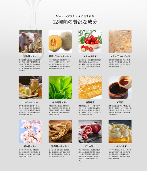 厳選された国産豚の胎盤から抽出した高品質なプラセンタエキスを200mg配合し、さらに12種類の美容・健康成分を贅沢にブレンド。毎日の習慣に取り入れることで、内側から輝く美しさと活力をサポートします。